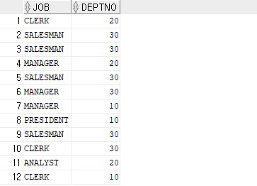 SELECT DISTINCT JOB, DEPTNO FROM EMP;